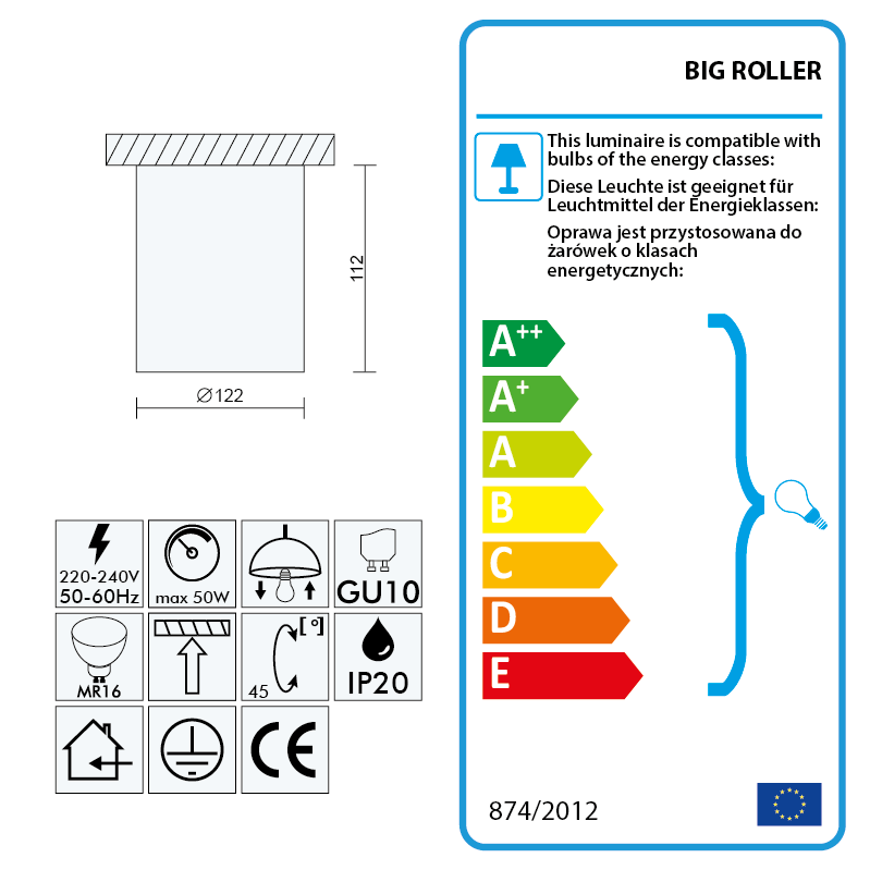 Lampa przystosowana jest do źródeł świateł z trzonkiem GU10 o maksymalnej mocy nie przekraczającej 50W.